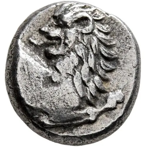 | Obverse description | Forepart of a lion right, head turned back to left. |