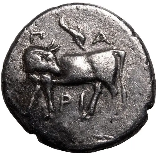 | Opis awersu | Bull standing left, head right; above dolphin. |