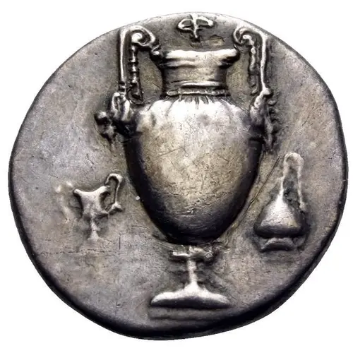 | Opis awersu | Amphora; above, Φ; in left field, kantharos; in right field, oinochoe. |