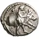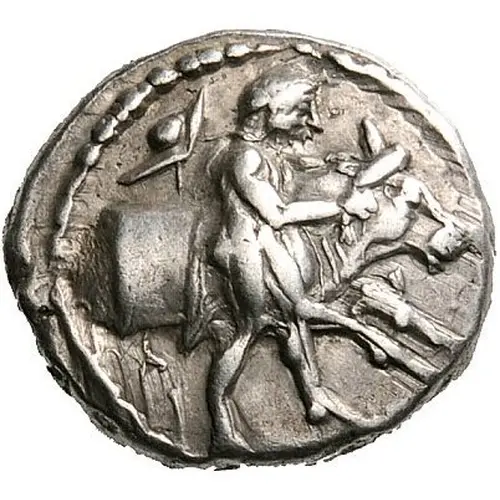 | 正面描述 | The hero Thessalos, nude but for petasos and cloak hanging behind his neck, standing right, holding a band in both his hands around the head of the forepart of a bull rushing right |