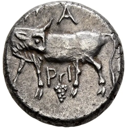| Beschrijving voorzijde | Bull standing left, head right; grape bunch below. |
