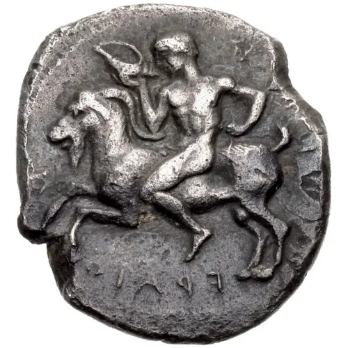 | Obverse description | Pan, holding kerykeion in left hand and blowing into conch shell in his right, riding goat right. |