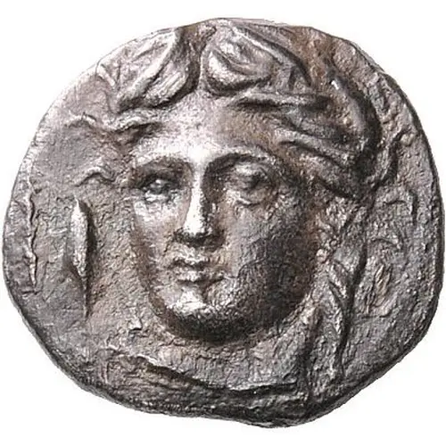 | Obverse description | Head of the water nymph Hypereia facing, turned slightly to left, wearing wreath of reeds in her hair, earring and necklace. To the left, a fish swimming upwards |