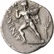 | 裏面の説明 | Phemios, as a slinger, nude but for chlamys over his shoulder and sword on baldric, standing facing, head turned to right, shooting his sling to right. Behind him, two spears leaning against his right leg and to right a palm branch |
