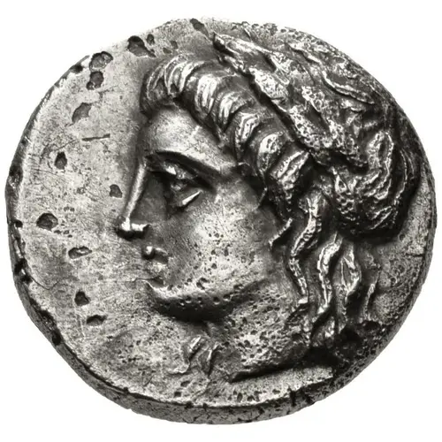| Описание аверса | Laureate head of Apollo left, with long hair. |