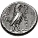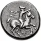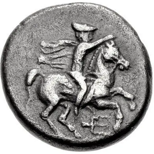 | Obverse description | Horseman, wearing chlamys and petasos, on horse galloping right, raising his right hand in salute; trident head below. |
