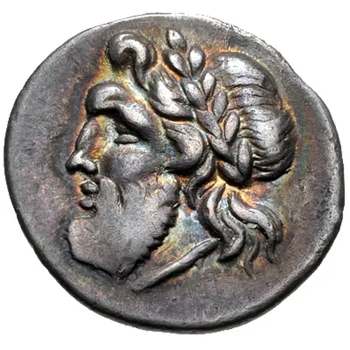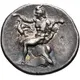 | Reverse description | Pan seated left on rock, holding lagobolon and raising hand and an eagle to the left |
