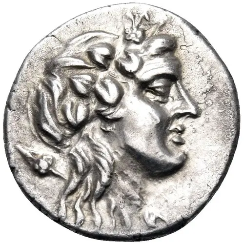 | Opis awersu | Wreathed head of young Dionysos right; thyrsos behind. |