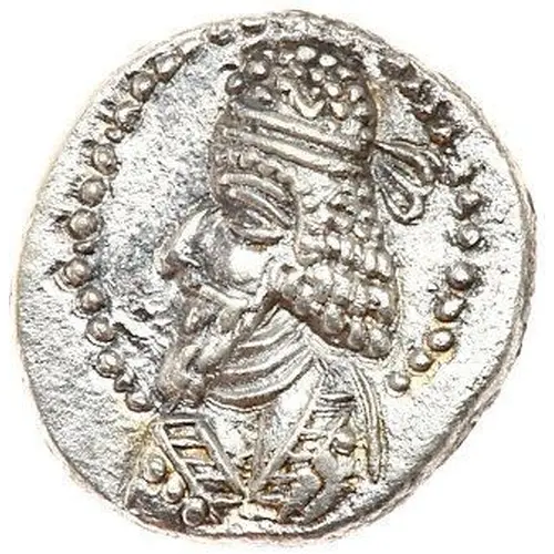 | Mô tả mặt trước | Bearded bust of Kapat left, wearing diadem and Parthian-style tiara with two rows of pellets and central pellet-in-crescent, pellet border. |