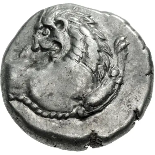 | Reverse description | Quadripartite incuse square with alternating raised and sunken quarters; pellet and sickle in one sunken quarter, pellet and monogram in the other. |