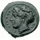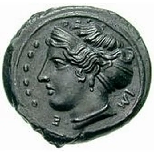 | Obverse description | Head of nymph left, hair bound in ampyx and sphendone; six pellets before. |