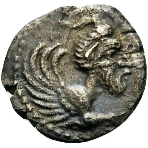 | Obverse description | Forepart of a human-headed monster to left, with beard, horn and wing |