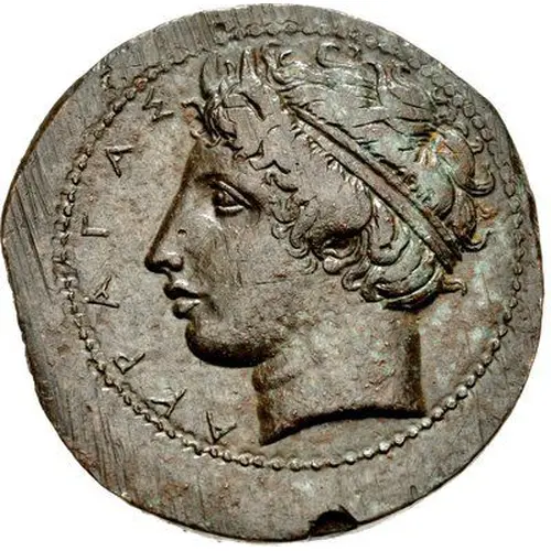 | Mô tả mặt trước | Horned head of Akragas facing left, wearing tainia; text at left; dotted border surrounding all. |