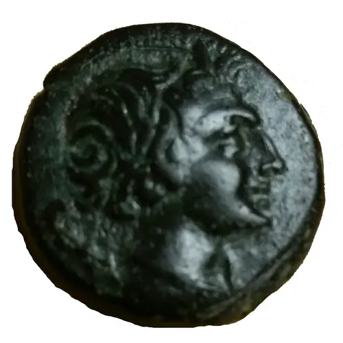 | Reverse description | Athena Alkidemos advancing right, helmeted, with aegis, hurling spear and protecting with her shield, two monograms in fields |