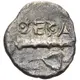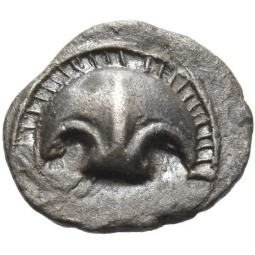 | Obverse description | Half of a Boeotian shield, with a rayed border. |
