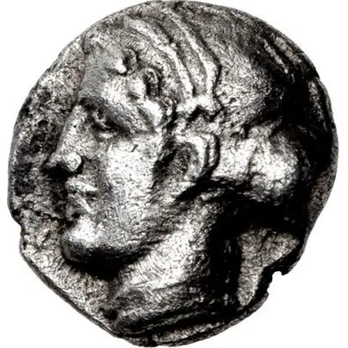 | Aversbeschreibung | Head of female left, hair in sakkos. |