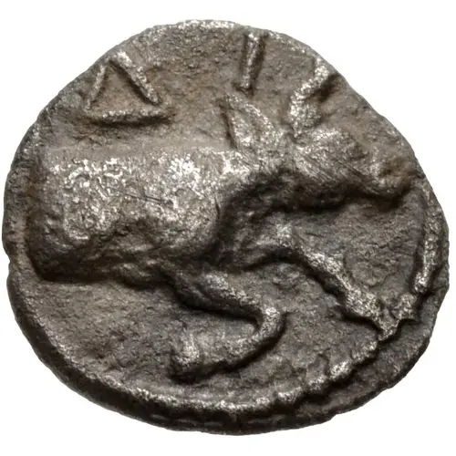 Technical/Grading: Measuring a mere 8mm and weighing 0.25 grams, this tiny silver denomination presents inherent challenges in strike quality. High-points for the nymph’s portrait would include the hair, forehead, and nose, while for the bull, the muzzle and shoulder. Due to the small flan size and manual striking process of the era, specimens often exhibit off-center strikes, minor flan irregularities, or areas of weakness, particularly towards the edges. A well-centered strike with clear details on both sides is highly desirable for this diminutive issue.