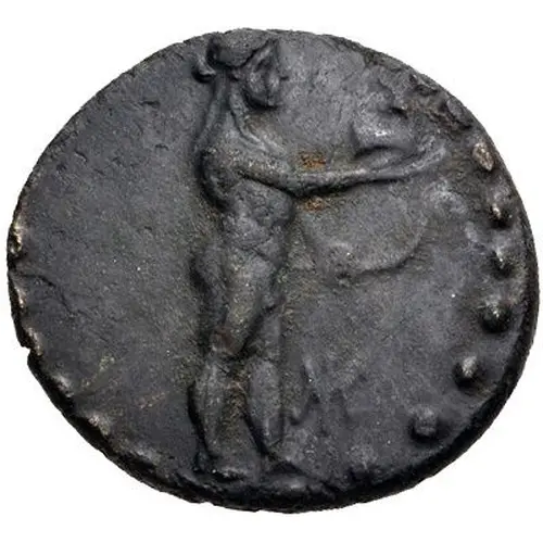 | Descripción del anverso | Apollo Didymeus standing right, holding small stag and bow; monogram to lower right. |
