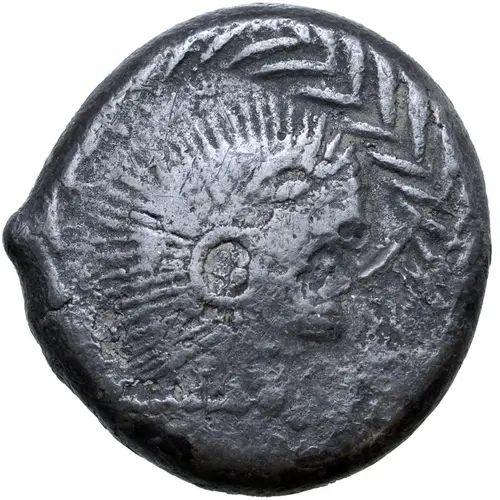 | Obverse description | Male head to right with radiating hair; all within wreath border. |
