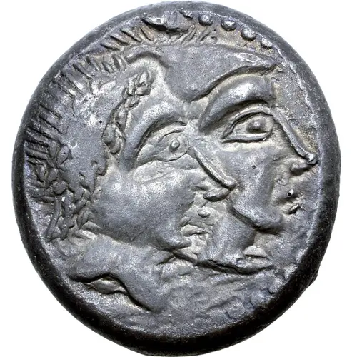 Obverse description Jugate male heads (`Honos` and `Virtus`) right, one wearing laurel wreath, the other wearing helmet.