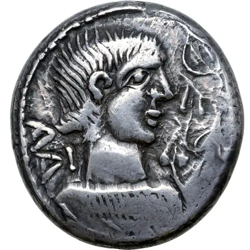 | Obverse description | Bare headed, draped male bust to right; monogram behind, three ivy leaves before. |