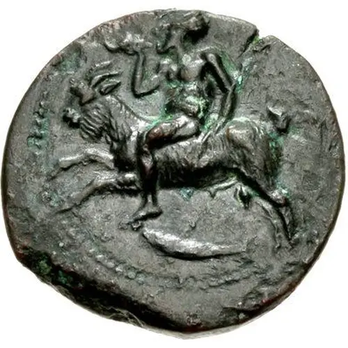 | توضیحات روی سکه | Pan, blowing into conch shell in his right hand and cradling lagobolon in left arm, riding goat springing to left. Below, fish to left |