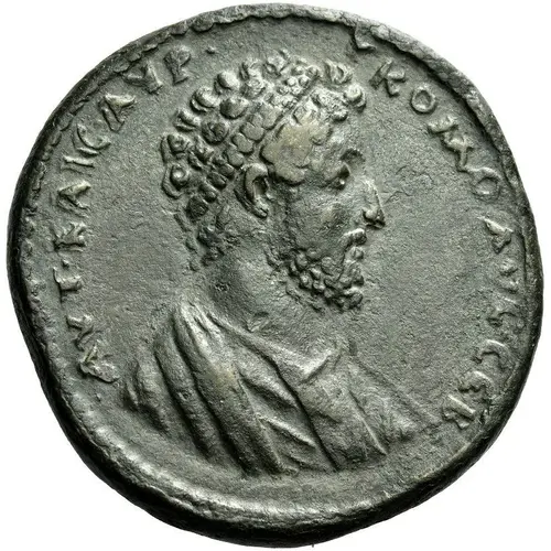 | Mô tả mặt trước | Bust of Commodus wearing crown and garment of demiourgos, right. |