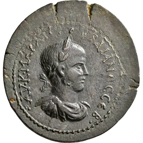 Technical/Grading: Struck in bronze, this substantial coin measures 31 mm and weighs 21.46 grams, indicative of a significant provincial denomination. Key high-points for assessing wear or strike quality include the emperor's hair and facial features on the obverse. On the reverse, the highest relief elements of the specific design are crucial. Provincial strikes often display varying die alignment and flan preparation. These, along with potential die wear, are critical factors in evaluating this Hexassarion's technical quality and grade.