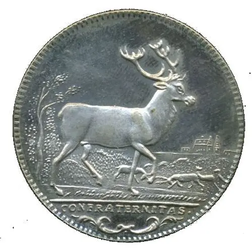 | Obverse description | Big stag striding to the right in front of the pack, in the background Jagdschloss (hunting castle) Kranichstein |