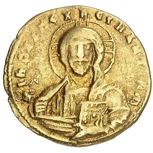 Bust of Christ facing, wearing nimbus, pallium and colobium, and raising right hand in benedictium with book of Gospels, lettering around. |