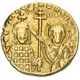 Facing bust of John, wearing crown and loros, holding patriarchal cross and the virgin Mary with hand at crown, in crowning motion. Lettering around. |