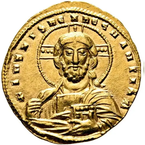 | Obverse description | Nimbate bust of Christ facing, cross in halo with three pellets in each arm, wearing tunic and holding the gospels. |
