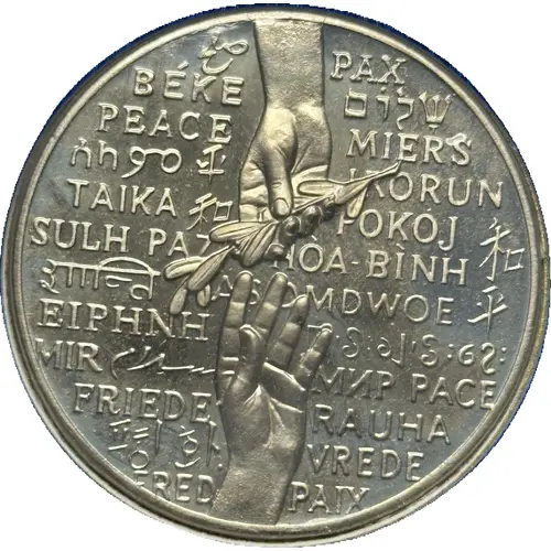 | Obverse description | The word Peace in 29 different languages An olive branch being passed |