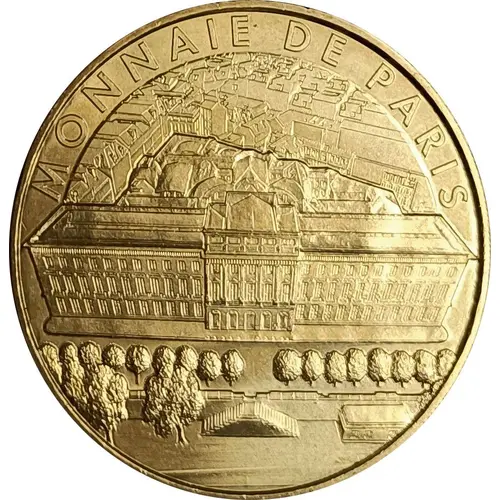 (fr) Sur la périphérie le mot France écrit en huit langues. France à 12H, 2025 à 6H, le tout relié par 14 étoiles à droite et à gauche. Au centre, bâtiment de la Monnaie de Paris. |