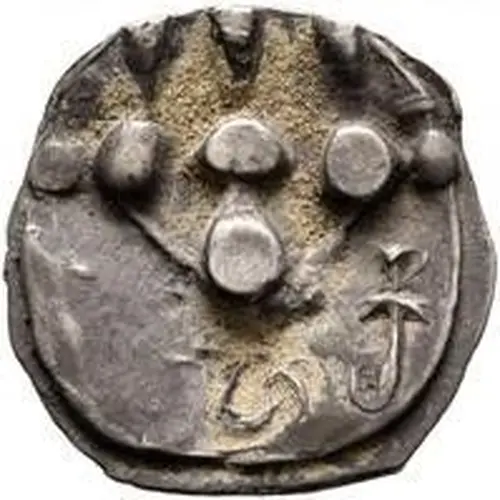 Obverse description Three Connected pellets above one pellet and Hunnic symbols with a dagger on right field.