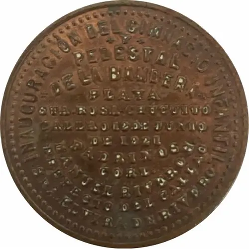 | Obverse lettering | INAUGURACION DEL GIMNASIO INFANTIL Y PEDESTAL DE LA BANDERA PLAYA STA. ROSA-CHUCUITO CALLAO 12 DE JUNIO DE 1921 PADRINOS MANUEL RIVERO H. PREFECTO DEL CALLAO SRA. ELVIRA DE RIVERO (Translation: INAUGURATION OF THE CHILDREN`S GYMNASIUM AND PEDESTAL OF THE FLAG SANTA ROSA BEACH -CHUCUITO CALLAO JUNE 12, 1921 GODPARENTS MANUEL RIVERO H. PREFECT OF CALLAO MRS ELVIRA DE RIVERO) |