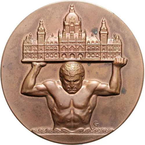 | Obverse description | Naked Atland in half figure over wave ornament from the front, who is lifting the town hall model over his head with both arms. |