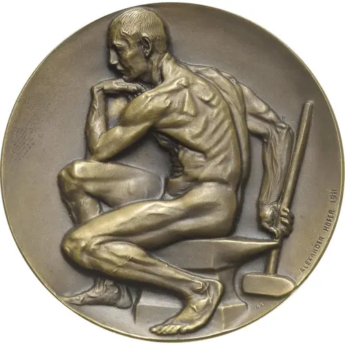 | Obverse description | Nude male figure sitting on an anvil with hammer in his right hand facing left. |