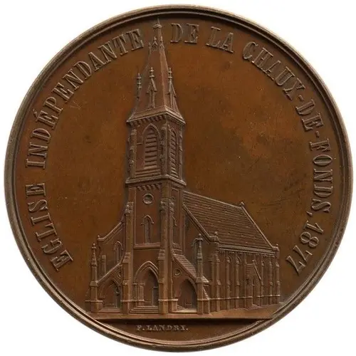 | Chữ khắc mặt trước | EGLISE INDÉPENDANTE DE LA CHAUX-DE-FONDS, 1877 F.LANDRY. (Translation: Independent Church of La Chaux-de-Fonds.) |