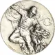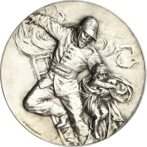 Obverse description Firefighter climbing down a ladder, holding a child in the left hand. Smoke to top.
