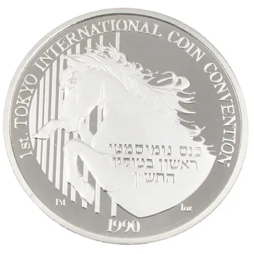 | Obverse lettering | 1st. TOKYO INTERNATIONAL COIN CONVENTION כנס נומיסמתי ראשון בטוקיו התש׳׳ן Pd 1oz 1990 |