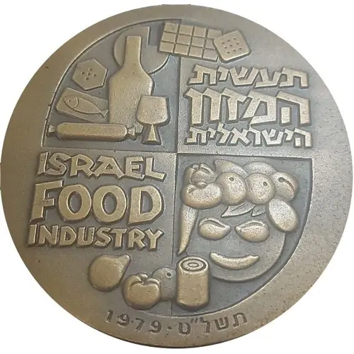 On the surface, the inscription: `Israel Food Industry` in Hebrew and English, and a representation of various products of the Industry. On the rim, below, the date: `5739-1979`. |