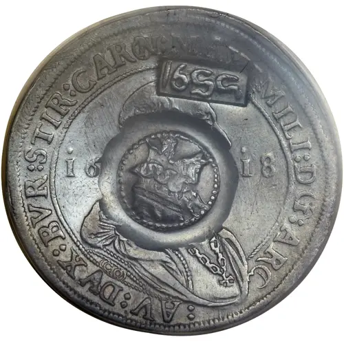 | Obverse description | Jefimok Rouble, counterstamp on Austria Hall mint Taler 1618. Counterstampes: date and horseman with spear. |