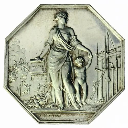 Allegorical figure of a woman carrying an insurance contract and a child; on the left a building on fire and on the right a building under construction. |