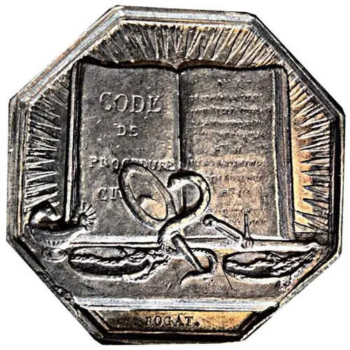 | Obverse description | Obverse partially depicting the Code de la Procédure Civile radiating open, in front of which are a mirror of truth and its serpent, a lighted antique lamp and a set of scales. Monnaie de Paris `lampe` hallmark on lower edge, or explicitly the word `ARGENT` preceded by an anchor. Engraver Rogat`s signature on the exergue. |