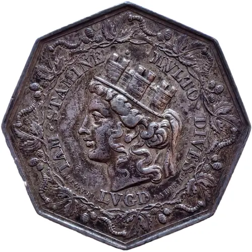 | Obverse description | Head on the left of the city of Lyon turreted in a wreath of mulberry leaves and worms. |