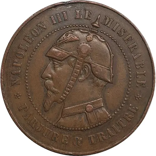 | Obverse lettering | ❀ NAPOLEON III LE - MISERABLE ❀ PARJURE & TRAITRE |