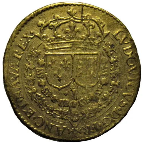 Accoladed shields of France and Navarre, surrounded by the collars of the King`s orders and surmounted by a closed royal crown. Between the two shields, a crowned L flanked by two lozenges. Titulature punctuated with lozenges. |