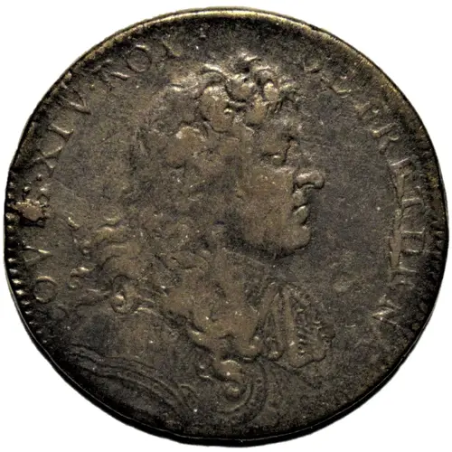 | Obverse description | Bust with tie of Louis XIV at right (not signed type Guéant Prieur 284E). Title around. |