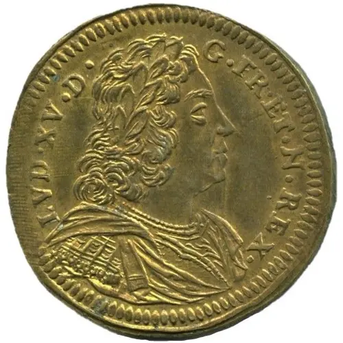 Obverse description Laurelled, draped and armored bust of Louis XV, turned right. Titulature around a toothed edge.